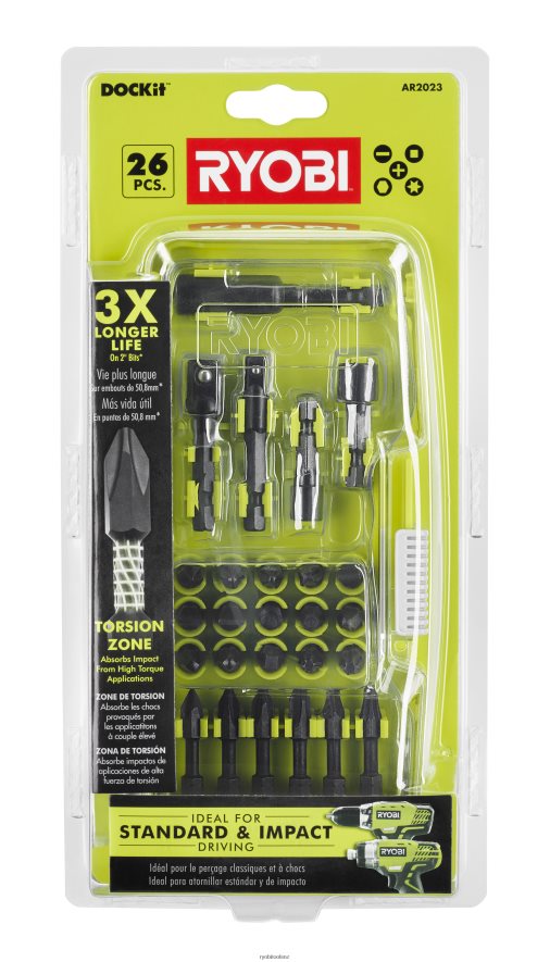 RYOBI introduces the 26 Piece Impact Driving Kit, the latest in RYOBI driving technology. The newly engineered Torsion Zone absorbs the impact from high torque driving applications, providing 3X Longer Life. These versatile bits are ideal for both standard and impact driving, so you can use your drill/driver or your impact driver with seamless compatibility and performance. RYOBI’s new impact driving bits are built to last and handle your most demanding driving needs.