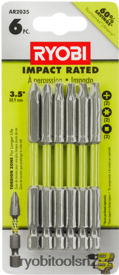 RYOBI Impact Rated Driving Bits are built to withstand the high torque and demand that comes with the use of an impact driver. Each bit features a Torsion Zone that is engineered to absorb the high torque the bits take on in many driving applications. The RYOBI 6-piece Set features a mixture 3-1/2 in. Phillips, Star and Square bits.