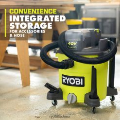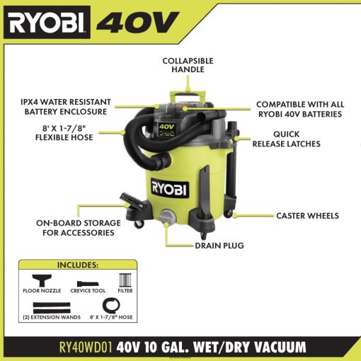 Enhance your RYOBI 40V System with the 40V 10 Gallon Wet/Dry Vacuum. This wet/dry vacuum delivers corded performance with up to 80 CFM and 50 IOW. Powerful suction paired with cordless convenience makes this vacuum the perfect solution for clean-ups around the jobsite, workshop, car, and more where a power outlet isn’t easily accessible. The integrated storage conveniently holds the included crevice tool, floor nozzle, and extension wands. For added protection, this vacuum features a water resistant battery enclosure that meets IPX4 standards. The 8′ x 1-7/8″ flexible hose locks securely in place to avoid accidental disconnection. This vacuum includes a cartridge filter for dry applications and a foam filter for wet applications. This battery operated wet/dry vacuum is compatible with the RYOBI 40V system of tools, batteries, and chargers. Backed by RYOBI’S 3-Year Manufacturer’s Warranty, the 40V 10 Gallon Wet/Dry Vacuum includes a Cartridge Filter, Foam Filter, 8′ x 1-7/8′ Hose, Crevice Tool, Floor Nozzle, Drain Plug, (2) Extension Wands, (2) Extension Wand Clips, (4) Casters and Operator’s Manual. Battery and charger sold separately.