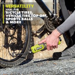 RYOBI introduces the USB Lithium High Pressure Inflator Kit. This USB Lithium High Pressure Inflator is the ideal solution for bicycle tires, top off of vehicle tires and sports balls to keep your day rolling. Utilize the digital pressure gauge for easy measurement reading and precise filling. The on-board LED worklight illuminates the application no matter the environment. With on-board storage, bring the included accessories and 6″ hose for on the go inflation. This product features an LED indicator to signal when the battery is charged (green) or has low battery (red) while in-use. The USB Lithium High Pressure Inflator Kit is part of the USB Lithium System that provides compact, portable, rechargeable solutions for cordless power and productivity. This USB Lithium High Pressure Inflator is backed by the RYOBI 2-Year Manufacturer’s Warranty and includes (1) FVIF51 USB Lithium High Pressure Inflator, (1) FVB01 USB Lithium 2Ah Battery, USB Cable, Sports Needle, Presta Valve Adaptor and Operator’s Manuals.