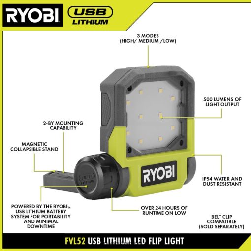 RYOBI introduces the USB Lithium LED Flip Light Kit. This light provides 500 lumens and has 3 light modes to provide the ideal amount of light needed every time. Mount and direct your light exactly where you need it with its pivoting stand, magnetic base, and 2-by mounting capability. This light delivers over 24 hours of clear coverage. With an IP54 rating for water and dust resistance, this light is built to withstand even the toughest conditions. The USB Lithium LED Flip Light Kit is a part of the USB Lithium System that provides compact, portable, rechargeable solutions for cordless power and productivity. This USB Lithium LED Flip Light Kit is backed by the RYOBI 2-Year Manufacturer’s Warranty and includes (1) FVL52 LED Flip Light, (1) FVB01 USB Lithium 2Ah Battery, USB Cable and Operator’s Manuals.