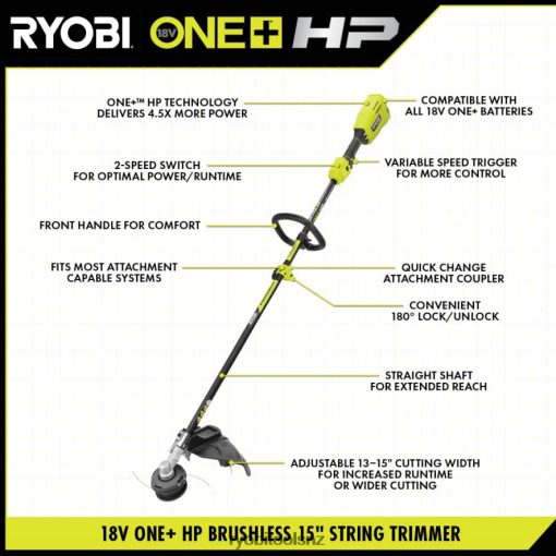 The RYOBI 18V ONE+ HP Brushless 15″ Attachment Capable String Trimmer is the best combination of power and versatility. It has a brushless motor for maximum power and durability. The EXPAND-IT attachment capability allows you to transform your trimmer into an edger, blower, pole saw and many more tools with the available attachments, meaning you can save time, space, and money. This trimmer is equipped with the REEL EASY+ bump feed Head with SPEED WINDER crank which can be reloaded in 60-seconds or less. The variable speed trigger and 2-speed switch deliver increased control for any application. The adjustable 13″ to 15″ cutting width allows you to optimize your trimmer for increased runtime or a wider cutting width. This lightweight and well-balanced design also has a front handle for comfort and the trimmer is equipped with a 6.0 Ah battery for extended runtime. The battery is compatible with the RYOBI ONE+ system. Backed by a 3-year warranty.