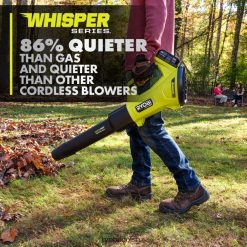 Enhance your RYOBI 18V ONE+ System with the 18V ONE+ HP 450 CFM Whisper Series Blower Kit. ONE+ HP technology combines a brushless motor, advanced electronics, and high performance lithium technology to deliver up to 450 CFM and 130 MPH, making this blower ideal for tackling wet or dry leaves and light yard debris. Experience exceptional performance with just the pull of a trigger, without the hassle of gas or cords. Enjoy up to 16 minutes of runtime in turbo mode with the included 18V ONE+ 4Ah lithium battery. This Whisper Series blower is engineered with noise dampening foam and a uniquely positioned fan to be 86% quieter than gas blowers, and even quieter than other cordless blowers, so you can work any time of day without disturbing others. A variable speed trigger and turbo button allow you to control the output of air, so you can dial back in delicate areas like blowing leaves from mulch beds and engage the turbo when clearing tougher debris. Plus, a cruise control dial locks in a speed without holding down the trigger. This blower comes with a customizable speed tip for increased air speed. Best of all, it’s part of the RYOBI ONE+ system – Any 18V ONE+ battery works with any 18V ONE+ product. The blower and battery are backed by a 3-year manufacturer’s warranty. This kit includes the P21014 18V 450 CFM Blower, PBP005 18V 4Ah Battery, PCG002 18V Charger, Blower Tube, Speed Tip, and Operator’s Manuals.