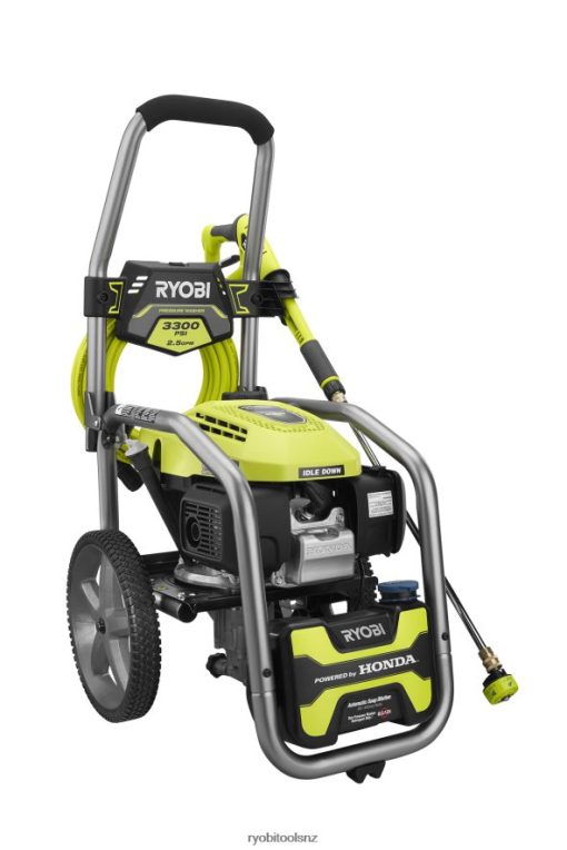 The RYOBI 3300 psi Pressure Washer is engineered to handle even your toughest jobs. With a powerful Honda GCV200 201 cc premium gasoline engine, this RYOBI Pressure Washer delivers 3300 psi of force for quick cleaning of driveways, decks, windows and other areas around the house. Featuring a durable and compact roll-cage frame and folding handle this pressure washer is designed for easy transport and storage. The engine is equipped with Idle Down Technology which decreases fuel consumption, reduces noise, and increases the overall life of the engine and pump. The on-board detergent tank offers hassle-free cleaning by eliminating the need to drag a bucket and hose behind you. The included 50 ft. non-marring high pressure hose provides 2X greater reach than a standard pressure washer hose, allowing users to reach areas you cannot bring your pressure washer. For added convenience, the RYOBI 3300 psi Pressure Washer is equipped with a 5-in-1 Quick-Connect Nozzle to easily switch spray patterns. The RYOBI 3300 psi Gas Pressure Washer is backed with the RYOBI 3-year limited tool warranty and 2-year engine warranty, and is guaranteed to deliver results for years to come.