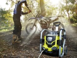 The RYOBI 40-Volt Lithium-Ion Pressure Washer is the perfect, easy-to-start, portable, cordless pressure washer. This pressure washer includes (2) 5.0 Ah batteries and eliminates the hassle of gas and electrical cords, making it simple to use. Just connect the garden hose or external water tank, insert the battery, press power and start cleaning. The pressure washer includes (2) battery ports for maximum run time, but only (1) battery is required for use. This pressure washer has two power modes: (1) the default setting produces 1000 PSI to extend run time for less demanding tasks, or (2) switch to boost mode for 1500 PSI of cleaning force when the task requires it. Quickly clean windows, patio furniture, bikes, cars and many other applications at home or on-the-go with the included 5 gallon water tank. The on-board detergent tank offers hassle-free cleaning, eliminating the need to carry a bucket of soapy water behind you. This model includes (3) nozzles: 15-degree, soap, and turbo for 50% faster cleaning. The RYOBI 40V Brushless 1500 PSI Cordless Pressure Washer combines portability with convenience and allows you to go anywhere the cleaning task awaits. Backed by a 5-year limited tool warranty and a 3-year limited battery warranty.