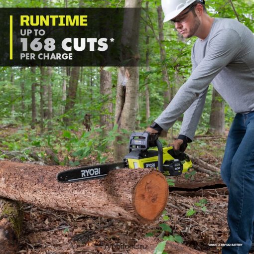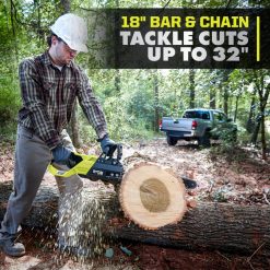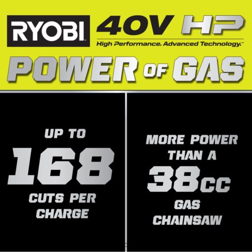 Enter the RYOBI 40V System with the 40V HP Brushless 18″ Chainsaw Kit. 40V HP technology delivers more power than a 38cc gas chainsaw, making this chainsaw a true gas replacement. This chainsaw gets up to 168 cuts per charge and is equipped with a premium full complement chain. 40V technology combines a brushless motor, advanced electronics, and high performance lithium technology to provide more power, longer runtime, faster cutting, and greater durability. The 18” bar and chain tackles cuts up to 32”, making it ideal for felling, bucking, and limbing. This chainsaw has an adjustable automatic oiler to keep the chain lubricated for longer chain life and an added chain brake for kickback protection. Adjust your chain for controlled, clean cuts using the tooled chain tensioning with on-board tool storage. Recharge your 40V 5Ah battery in less than 50 minutes with the included 40V Rapid Charger. Best of all, it is part of the RYOBI 40V system where any 40V battery works with any 40V product. This 40V HP Brushless 18” Chainsaw Kit is backed by the RYOBI 5-Year Manufacturer’s Tool Warranty, 3-Year Manufacturer’s Battery Warranty, and includes RY40508 40V HP Brushless 18″ Chainsaw, OP40504 5Ah Lithium Battery, OP406 40V Rapid Charger, Scabbard, Combination Wrench, Chainsaw Case, and Operator’s Manuals.
