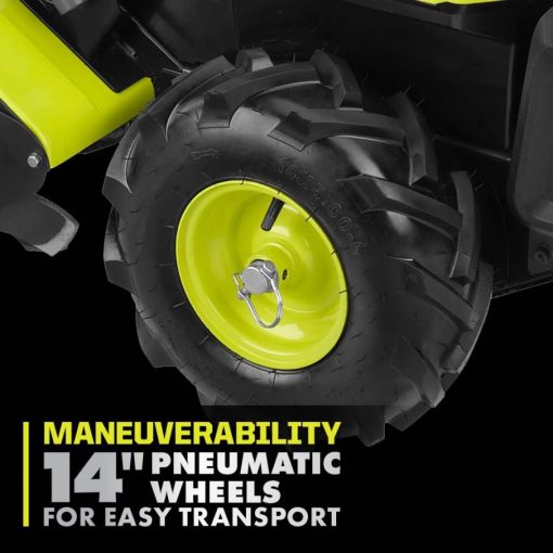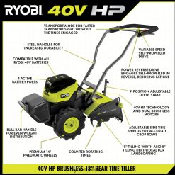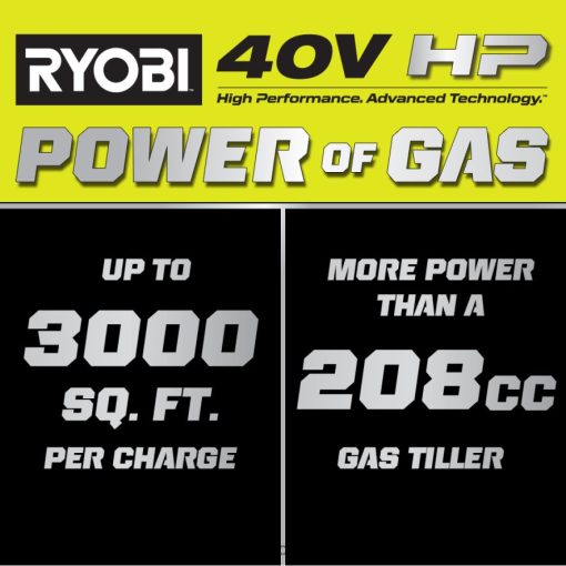 Enter the RYOBI 40V System with the RYOBI 40V HP Brushless 18″ Rear Tine Tiller Kit. 40V HP Technology delivers more power than a 208cc gas tiller, making this tiller a true gas replacement. 40V HP technology combines two brushless motors and counter rotating tines to provide the power to break new ground and tackle tough terrain with an 18” tilling width & 10” tilling depth. With up to 3,000 sq. ft. per charge, the size of 1 tennis court, this tiller is perfect for everything from large gardens to small farms. It’s equipped with variable speed self-propelled providing smoother operation & effortless control, even in reverse. In transport mode, activate self-propel function without engaging the tines. Choose your tilling depth using the 9-position adjustable depth stake, and for protection of surrounding plants & ensuring accurate crop rows, use the adjustable side tine shield. The removable sand ballast & the bull bar allow you to add weight and evenly distribute it. Recharge (2) 40V 6Ah batteries simultaneously in less than 60 minutes with the included 40V Dual-Port Rapid Charger. Best of all, it is part of the RYOBI 40V system where any 40V battery works with any 40V product. This RYOBI 40V HP Brushless 18″ Rear Tine Tiller Kit is backed by the RYOBI 5-Year Manufacturer’s Tool Warranty, 3-Year Manufacturer’s Battery Warranty, and RY40702 40V HP Brushless 18″ Rear Tine Tiller, (4) OP40605 40V 6Ah Lithium Batteries, OP409 40V Dual-Port Rapid Charger, and Operator’s Manuals.