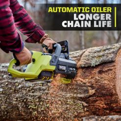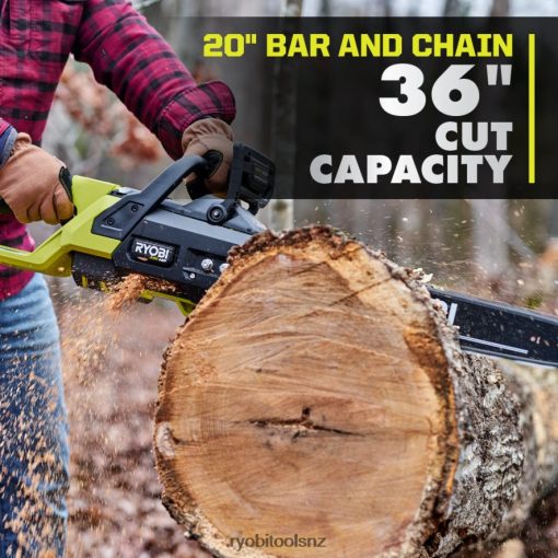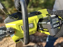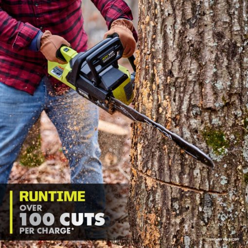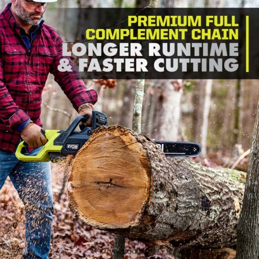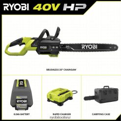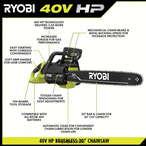 Enter the RYOBI 40V System with the 40V HP Brushless 20″ Chainsaw Kit. 40V HP technology delivers more power than a 50cc gas chainsaw, making this chainsaw a true gas replacement. This chainsaw gets over 100 cuts per charge and is equipped with a premium full complement chain. 40V technology combines a brushless motor, advanced electronics, and high performance lithium technology to provide more power, longer runtime, faster cutting, and greater durability. The 20” bar and chain tackles cuts up to 36”, making it ideal for felling, bucking, and limbing. This chainsaw has an automatic oiler to keep the chain lubricated for longer chain life and an added mechanical chain brake for kickback protection. Adjust your chain for controlled, clean cuts using the tooled chain tensioning with on-board tool storage. Best of all, it is part of the RYOBI 40V system where any 40V battery works with any 40V product. This 40V HP Brushless 20” Chainsaw Kit is backed by the RYOBI 5-Year Manufacturer’s Tool Warranty, 3-Year Manufacturer’s Battery Warranty, and includes RY405011 40V HP Brushless 20” Chainsaw, OP4080A 40V 8Ah Lithium Battery, OP406A 40V Rapid Charger, Scabbard, Combination Wrench, Carry Case, & Operator’s Manuals.