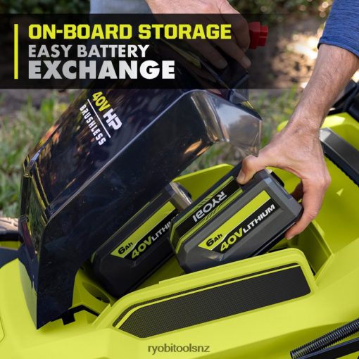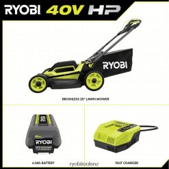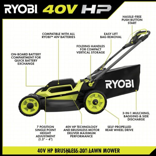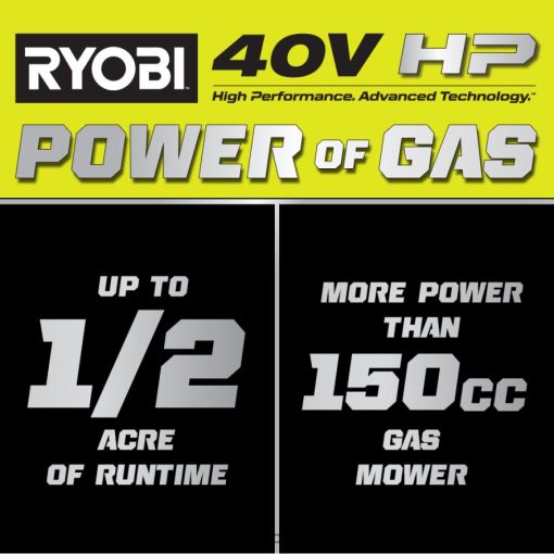 Enter the 40V System with the RYOBI 40V HP Brushless 20” Self-Propelled Lawn Mower. With 40V HP technology, it delivers more power than a 150cc gas mower, making it a true gas replacement. Ideal for up to 1/2 acre, this mower comes with an included 40V 6Ah lithium battery for up to 42 minutes of runtime. 40V HP technology combines a brushless motor, advanced electronics, and lithium batteries that automatically react to mowing conditions by increasing the blade speed to eliminate bogging down and power through the toughest cut. Plus, its variable speed self-propelled drive system helps you finish the job quickly and effortlessly. Best of all, it is part of the RYOBI 40V system where any 40V battery works with any 40V product. This self-propelled mower is backed by the RYOBI 5-Year Manufacturer’s Tool Warranty, 3-Year Manufacturer’s Battery Warranty, and includes the RY401018 40V HP Brushless 20″ Self-Propelled Mower, OP40605 40V 6Ah Lithium Battery, OP408 40V Fast Charger, Grass Catcher Bag, Start Key, Mulch Plug, Side Discharge Chute, and Operator’s Manuals.