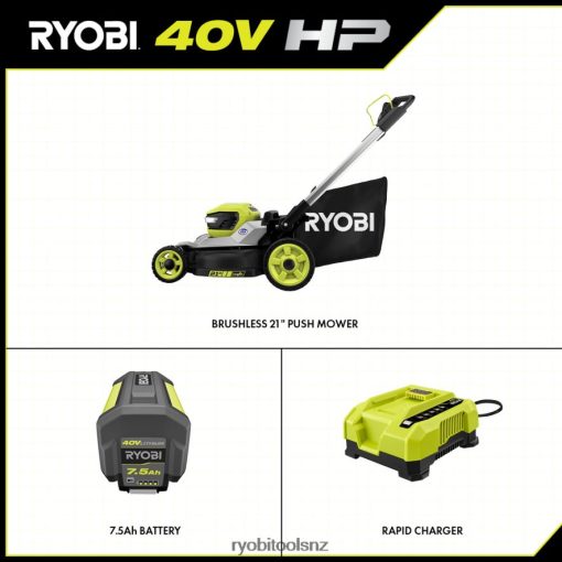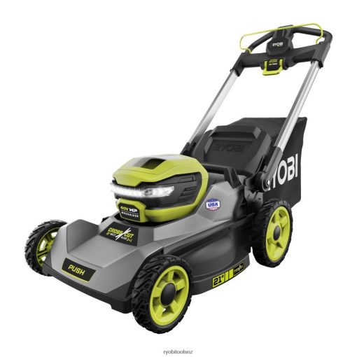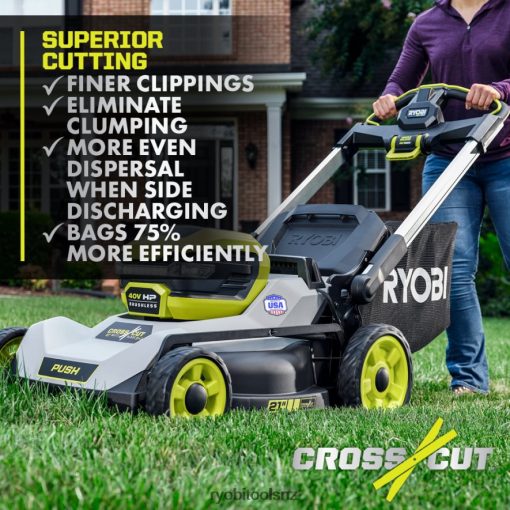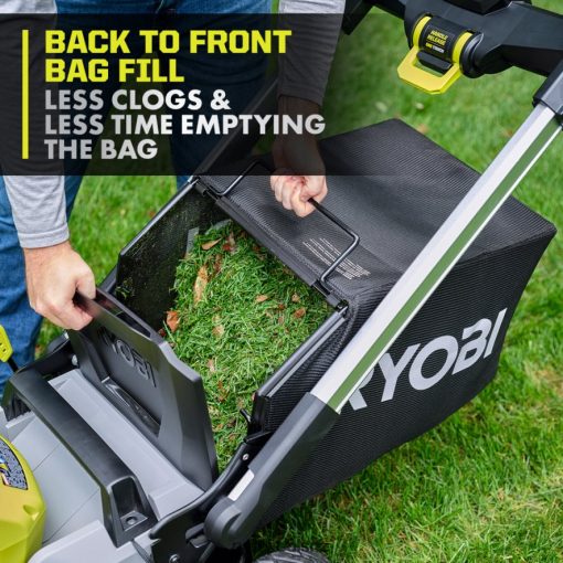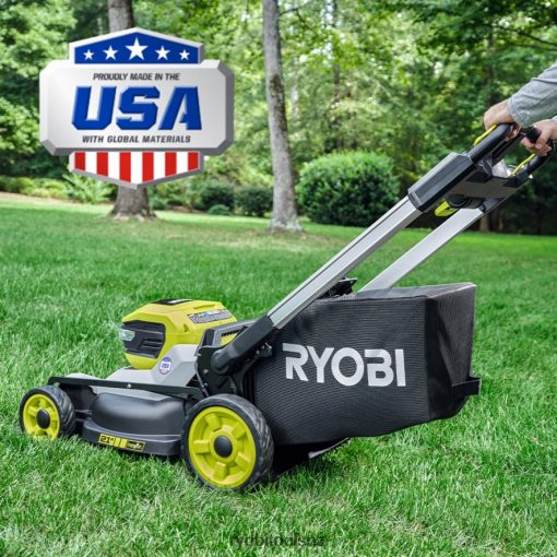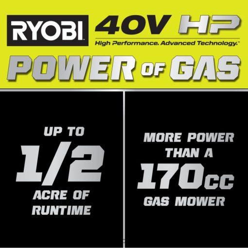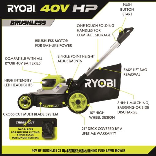 The RYOBI 40V HP Brushless 21″ Multi-Blade Cordless Push Lawn Mower delivers the power of gas with the convenience of cordless. The premium HP brushless motor provides more power, longer runtime, and a longer motor life. It starts with just a push of a button, without the hassle of gas, oil, or maintenance. This mower is ideal for yards up to 1/2 acre, featuring dual active battery ports and a 40-Volt 7.5Ah battery that provides up to 50-minutes of runtime. The CROSS CUT Multi-Blade System offers two blades for superior cutting performance or a single blade for longer runtime. The durable 21″ deck is lightweight, resists corrosion, and is covered by a lifetime warranty. The mower has a large 10″ high wheel design for easy maneuverability and the deck features 7-position single point height adjustment to easily select your grass height between 1.5″ and 4″. With the 3-in-1 mowing functions you can choose between bagging, mulching, or side discharge functions. An easy lift single motion bag removal allows you to quickly and easily empty the grass catcher bag and 1-touch aluminum handles fold for compact, vertical storage. This mower includes a 40V rapid charger to charge your batteries 4X faster than the standard charger. This mower is proudly made in the USA with global materials and is backed by a 5-Year Tool Warranty.