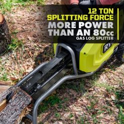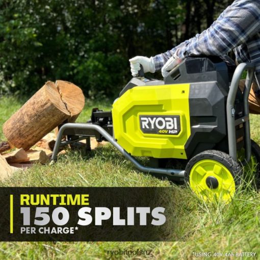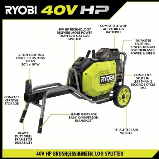 Enter the RYOBI 40V System with the RYOBI 40V HP Brushless Kinetic Log Splitter Kit. 40V HP Technology delivers 12 tons of splitting force with more power than an 80cc gas log splitter, making this a true gas replacement. 40V HP technology combines a brushless motor, advanced electronics, and high performance lithium technology to provide more power, longer runtime, and greater durability. This log splitter has the power to split hardwoods like white oak, red oak, and hickory. Save time with the kinetic design, which yields a fast, 2 second cycle time and 10X faster splitting. With 150 splits per charge, this kinetic log splitter is perfect for splitting chopped down or fallen trees into smaller pieces of firewood. Easily transport the kinetic log splitter around your yard with the comfortable hand grips & all-terrain wheels. The heavy-duty steel frame can handle even the toughest terrain, and the stores vertically when the job is done. Best of all, it is part of the RYOBI 40V system where any 40V battery works with any 40V product. This RYOBI 40V HP Brushless Kinetic Log Splitter Kit is backed by the RYOBI 5-Year Manufacturer’s Tool Warranty, 3-Year Manufacturer’s Battery Warranty, and includes RY40704 40V HP Brushless Kinetic Log Splitter, OP40404 40V 4Ah Lithium Battery, OP404 40V Charger, Wedge, Scabbard/Cover, Wheels, Hardware, and Operator’s Manuals.