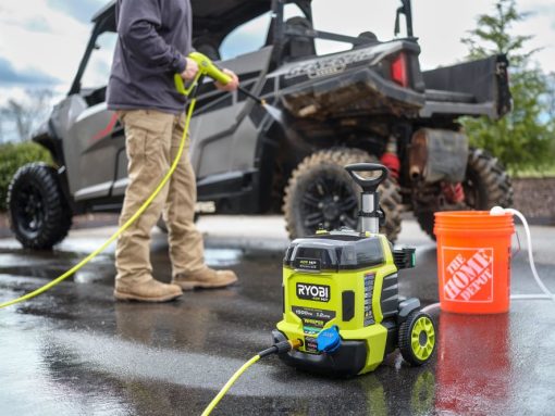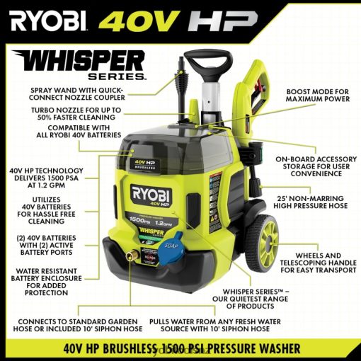 Enhance your 40V System with the RYOBI 40V HP Pressure Washer. Advanced 40V HP technology utilizes a brushless motor, advanced electronics, and lithium battery to deliver up to 1,500 PSI and 1.2 GPM for powerful, portable cleaning. No gas, no maintenance, and no hassle. For maximum runtime, use this pressure washer on the default setting for 1000 PSI performance. When ultimate power is needed, unleash 1,500 PSI on boost mode. The brushless motor and lithium technology provide up to 25 minutes of runtime with the (2) included 40V 6Ah batteries. This Whisper Series pressure washer is engineered to be 81% quieter than gas pressure washers, allowing you to clean any time of day without disturbing others. Enhance your pressure washer with RY31012VNM 12″ surface cleaner for quick, streak-free cleaning, RY31211 Water Broom for effective dirt and debris removal, and the RY31F04 Foam Blaster for controlled foam detergent dispensing. Best of all, it is part of the RYOBI 40V System where any 40V battery works with any 40V product. This 40V HP Pressure Washer is backed by the RYOBI 5-year manufacturer’s warranty and the included batteries are covered by the 3-year manufacturer’s battery warranty. This pressure washer includes the RY40PW15 40V Pressure Washer, (2) OP40605 40V 6Ah lithium batteries, Trigger Handle, Spray Wand, 25′ Non-Marring High Pressure Hose, 10′ Siphon Hose, Nozzles (15 degree, Soap, and Turbo), Self Priming Adaptor, and Operator’s Manuals.