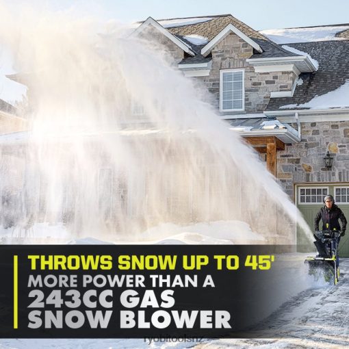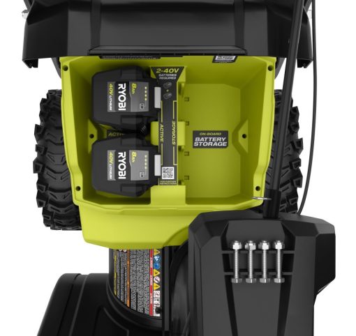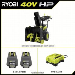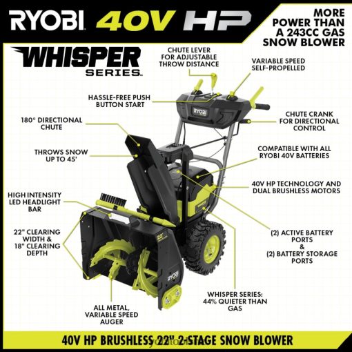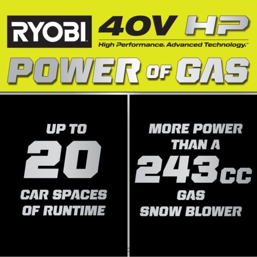 Enhance your RYOBI 40V System with the RYOBI 40V HP Brushless 22” Snow Blower Kit. 40V HP Technology combines a brushless motor, advanced electronics and high performance lithium technology to deliver more power than a 243cc gas snow blower, making this a true gas replacement. The powerful motor throws snow up to 45′ away and gets up to 30 minutes of runtime using the (2) included 40V 8Ah batteries, enough to clear up to 20 car spaces of snow. This Whisper Series snow blower is engineered to be 44% quieter than gas, and even quieter than other cordless snow blowers, allowing you to work any time of day without disturbing others. The 22 in. clearing width and 18 in. clearing depth make this snow blower ideal for large sidewalks and driveways. It features a variable speed self-propelled drive system to finish the job quickly and effortlessly. For increased control and durability, the snow blower also features a variable speed all steel auger and 180 degree directional chute to direct snow throwing direction. Best of all, it is part of the RYOBI 40V system where any 40V battery works with any 40V product. This 40V HP Brushless 22″ Snow Blower Kit is backed by the RYOBI 5-Year Manufacturer’s Tool Warranty, 3-Year Manufacturer’s Battery Warranty, and includes the RY408150 40V Brushless 22″ Snow Blower, (2) OP4080A 40V 8Ah Batteries, 40V Rapid Charger, Clean Out Tool, Upper Handle Assembly, Chute Assembly, Chute Crank Assembly and Operator’s Manuals.