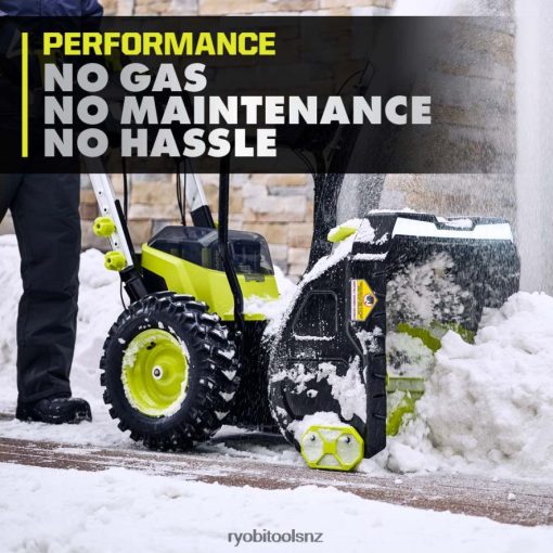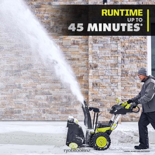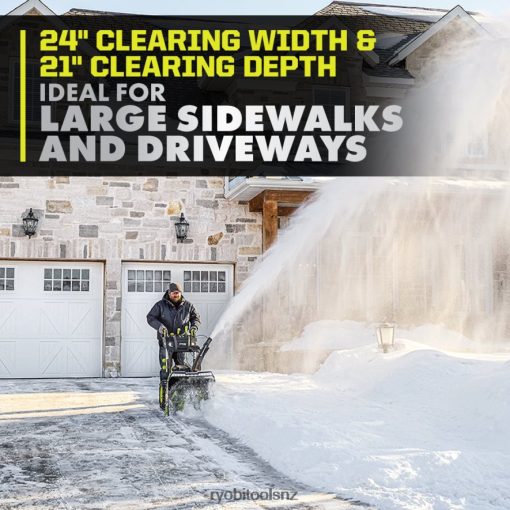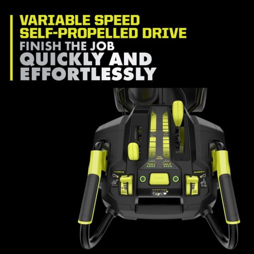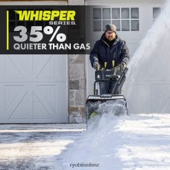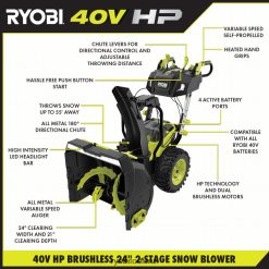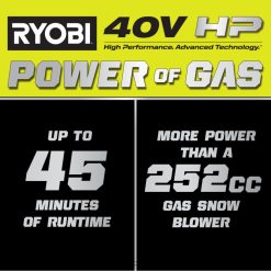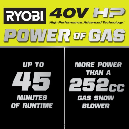 Enter the RYOBI 40V System with the RYOBI 40V HP Brushless 24″ Snow Blower Kit. 40V HP technology delivers more power than a 252cc gas snow blower, making this a true gas replacement throwing snow up to 55′. 40V HP Technology combines brushless motors, advanced electronics and high performance lithium technology to deliver the power of gas without the hassle. This snow blower gets up to 45 minutes of runtime to clear up to 31 car spaces using the (4) active battery ports and (4) 40V 6Ah batteries. As part of the WHISPER SERIES, it is engineered to be 35% quieter than gas and even other cordless snow blowers, allowing you to work any time of day. The 24” clearing width and 21” clearing depth make it ideal for large sidewalks and driveways. It features a variable speed self-propelled drive system to finish the job quickly and effortlessly. For increased control and durability, the variable speed steel auger tackles heavy-duty clearing and it features a 180 degree directional chute. Recharge (2) 40V 6Ah batteries simultaneously in less than 60 minutes. Best of all, it is part of the RYOBI 40V system where any 40V battery works with any 40V product. This 40V HP Brushless 24″ Snow Blower Kit is backed by the RYOBI 5-Year Manufacturer’s Tool Warranty, 3-Year Manufacturer’s Battery Warranty, and includes RY40807 40V HP Brushless 24″ Snow Blower, (4) OP40605 40V 6Ah Lithium Batteries, OP409 40V Dual Port Rapid Charger, Assembly Hardware, and Operator’s Manuals.
