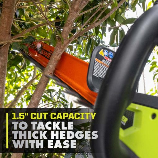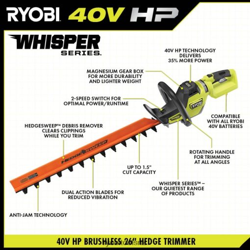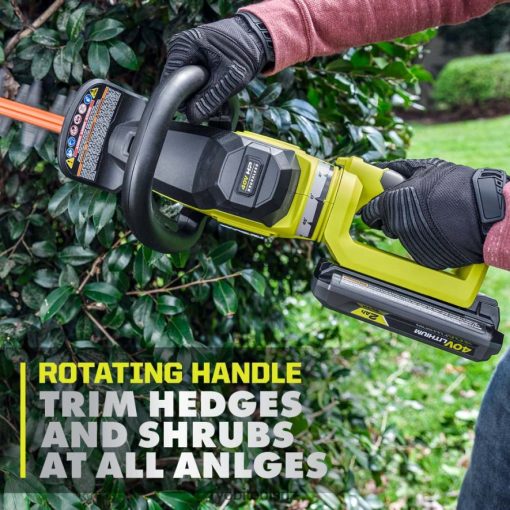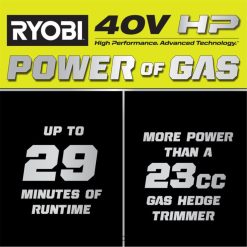 Enhance your 40V system with the 40V HP 26” Hedge Trimmer Kit. 40V HP technology delivers more power than a 23cc gas hedge trimmer, without the hassle of gas or cords. Using the included 40V 2Ah battery, you’ll achieve up to 29 minutes of runtime. 40V technology combines a brushless motor advanced electronics, and high performance lithium technology with 26” blades and an impressive 1-” cut capacity to tackle thick hedges with ease. Anti-jam technology prevents the blades from getting stuck on branches while dual action blades power through hedges with reduced vibration and less fatigue. This Whisper Series trimmer is engineered to be 72% quieter than gas, and even quieter than other cordless hedge trimmers. A magnesium gearbox increases durability and makes the hedge trimmer lighter weight. The rotating handle allows you to comfortably trim hedges and shrubs at all angles, while the HEDGESWEEP Debris Remover makes it easy to clear clippings while you trim. The 2-speed switch allows you to choose between two cutting speeds to maximize power or optimize runtime. Best of all, it is part of the RYOBI 40V System where any 40V battery works with any 40V product. This 40V HP Hedge Trimmer is backed by the RYOBI 5-year manufacturer’s warranty and the included battery is backed by the RYOBI 3-year battery warranty. This kit includes the RY40606 40V Hedge Trimmer, OP40204 40V 2Ah Lithium Battery, OP406 40V Rapid Charger, HEDGESWEEP Debris Remover, Scabbard, and Operator’s Manuals.