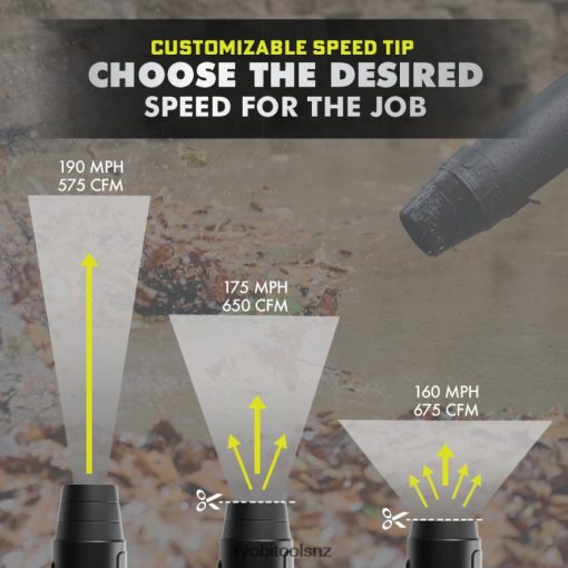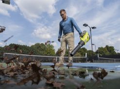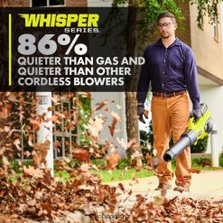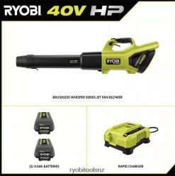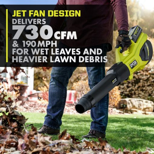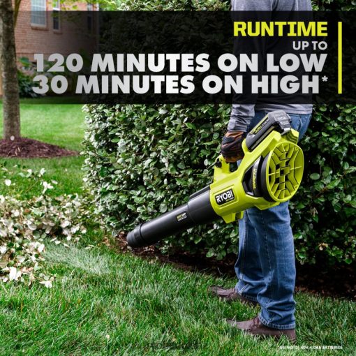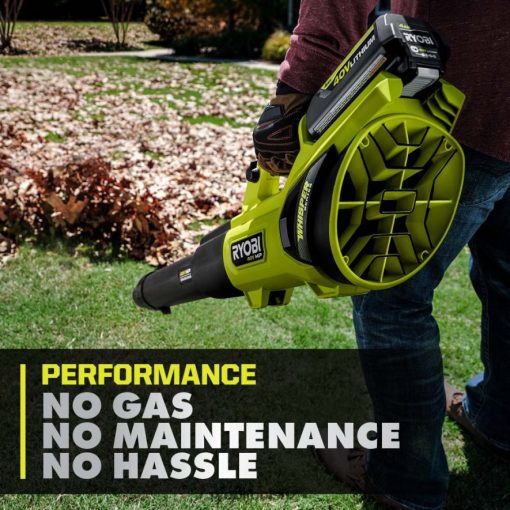 Enhance your 40V System with the 40V HP Cordless Jet Fan Blower. Using 40V HP technology and a jet fan design, this blower delivers more power than a 27cc gas blower. Experience the performance of gas without the gas, maintenance, or hassle. This blower runs for up to 30 minutes when paired with the included (2) 40V 4Ah batteries. 40V HP technology combines a brushless motor, advanced electronics and lithium technology to power through heavy lawn debris and wet leaves with 730 CFM and 190 MPH. Designed with noise dampening foam and a uniquely positioned fan, this Whisper Series blower is engineered to be 86% quieter than gas and even other cordless blowers. The variable speed trigger and turbo button allow you to control the output of air, so you can dial back when in delicate areas like blowing leaves from mulch beds and engage the turbo when clearing tougher debris. Using the two included customizable speed tips, you can maximize your blowing power with increased air speed. Best of all, this is part of the RYOBI 40V System where any 40V battery works with any 40V product. This 40V HP Blower kit is backed by the RYOBI 5-year manufacturer’s warranty and 3-year manufacturer’s battery warranty. This kit includes the RY404010 40V Jet Fan Blower, (2) OP40404 40V 4Ah Lithium Batteries, OP406 40V Rapid Charger, Blower Tube, (2) Speed Tips, and Operator’s Manuals.