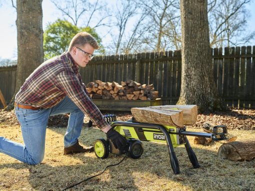The RYOBI 15 Amp Electric Log Splitter delivers a powerful 5-Tons of splitting force, with the capacity to cut logs up to 20″ W and 10″ Dia. The 15 Amp Electric Motor easily starts with the push of a button, no mixing of gas and oil or hassle maintaining a gas engine. The 2-handed operation design maximizes user safety and control for ease of use. Reinforced with a heavy-duty steel frame for durability this log splitter will withstand years of use. The compact design features front legs that double as a hand grip and wheels for easy 1-person transport. When the job is complete store the unit horizontally, or vertically for more compact storage. The RYOBI 15 Amp Electric Log Splitter is backed by a 5-year limited tool warranty.