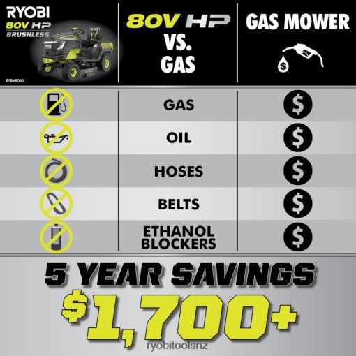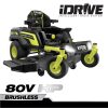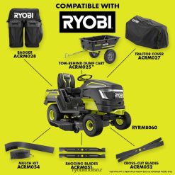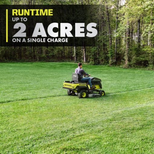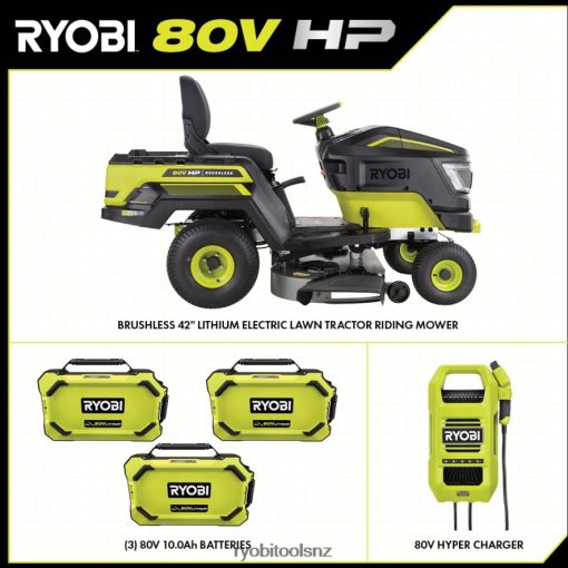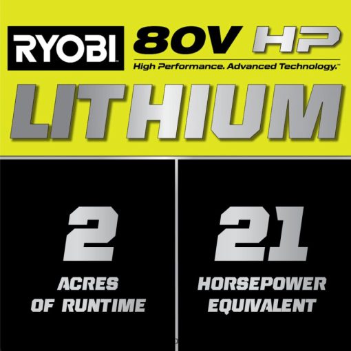 Introducing RYOBI’s first lithium-ion battery powered Riding Lawn Tractor, the RYOBI 80V HP 42″ Lithium Electric Riding Lawn Tractor. 80V HP Technology combines brushless motors, advanced electronics, and lithium-ion batteries to deliver the power equivalent to a 21 horsepower gas engine*, delivering all the power, without gas, engine maintenance, and significantly less noise. This tractor is powered by 3 brushless motors and 3 80V 10Ah batteries to cut up to 2 acres per charge. When the job is done, the tractor fully recharges in less than 2.5 hours with the included Hyper Charger and on-board charging port. The most versatile Riding Lawn Tractor in the industry features front and rear storage compartments to haul mulch, logs, plants, or any material around the yard. Make quick work of towing, with a capacity of 500 lbs. and a universal 2″ square hitch in the front and rear of the Tractor. The Tractor is equipped with a 10-gauge heavy-duty fabricated steel deck and the CROSS CUT multi-blade system that uses 4 steel blades to achieve a superior cut. Remove the deck in under 90 seconds for quick blade maintenance. The full color back lit LCD screen displays runtime, battery level, and charge status while the RYOBI Riding Mower app allows you monitor your charge status from your phone. Mobile Service available in select regions. If your riding mower requires attention, a certified RYOBI support technician can diagnose & service right from your home. Some services may require you to bring your mower to one of the 300+ service centers nationwide. This Tractor is proudly made in the USA with globally sourced materials and has a 5-year limited warranty.