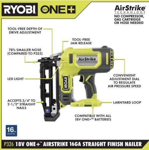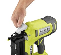 RYOBI introduces the 18V ONE+ 16-Gauge Cordless AirStrike Finish Nailer with 1.5 Ah Battery and Charger. This Finish Nailer features AirStrike Technology, which eliminates the need for noisy compressors, bulky hoses, or expensive gas cartridges. This means faster setup and easy maneuverability on the job site. This Straight Finish Nailer is capable of sinking up to 2-1/2 in. nails in hardwoods. The tool-free depth of drive adjustment allows for proper setting of nail heads. This nailer allows for extended periods of continuous work by sinking up to 1,000 nails per charge. It additionally offers a 78% smaller nose for tight spot access and superior drive quality, compared to P325. There is also a convenient adjustment dial to regulate air pressure speed for optimal performance. Great for crown molding, baseboard and exterior trim, this Finish Nailer is the perfect addition to any carpenter or DIYer’s tool collection. The included battery and charger are compatible with all RYOBI 18V ONE+ Tools. This kit is backed by the RYOBI 3-Year Manufacturer’s Warranty and includes 2 non-marring pads, a 1.5 Ah Battery, an 18V Charger, and operator’s manuals.