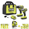 The RYOBI 18V ONE+ HP Brushless 2-Tool Combo Kit includes a 1/2″ Drill/Driver, 1/4″ Impact Driver, (2) 18V ONE+ 2Ah Lithium HIGH PERFORMANCE Batteries, charger & tool bag with FREE 18V ONE+ HP Brushless 4-1/2″ Angle Grinder/Cut-Off Tool and FREE select tool of choice. The 1/2″ Drill/Driver features a brushless motor, delivering up to 20% faster drilling and up to 50% more torque saving time and energy per application. Its 750 in-lbs. of torque maximizes output power when drilling through tough materials. The 1/4″ Impact Driver features a brushless motor delivering up to 25% faster driving. The brushless motor delivers up to 2,200 in-lbs. of torque, providing this tool the power to drive longer fasteners through tough materials. Best of all, it is part of the RYOBI ONE+ System that all work on the same battery platform. This 18V ONE+ HP Brushless 2-Tool Combo Kit is backed by the RYOBI 3-Year Manufacturer’s Warranty and includes PBLDD01 18V ONE+ HP Brushless 1/2″ Drill/Driver, PBLID01 18V ONE+ HP Brushless 1/4″ Impact Driver, (2) PBP003 18V ONE+ 2Ah Lithium HIGH PERFORMANCE Batteries, Charger, Bag, and operator’s manuals with FREE PBLAG01B 18V ONE+ HP Brushless 4-1/2″ Angle Grinder/Cut-Off Tool and FREE select tool of choice.