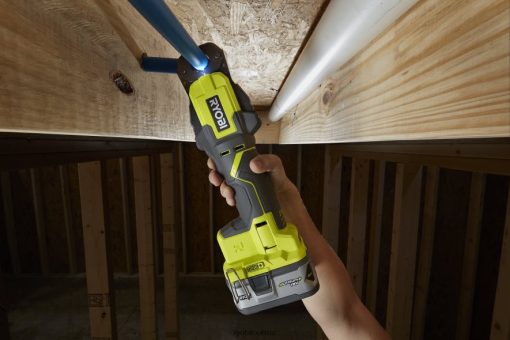 RYOBI introduces the ONE+ PEX Crimp Ring Press Tool. With 320 crimps per charge and an easy one-handed crimping operation the Crimp Ring Press Tool eliminates user fatigue and allows you to get the job done faster. The crimp cycle takes less than 5 seconds with a LED light to indicate completion. The Crimp Ring Press Tool fits all PEX sizes from 3/8″, _”, ” and 1″. The jaws of the tool fit a 1″ ring and die inserts for _” and ” rings are included (3/8″ insert not included) as well as a Go/No Go Gauge to ensure a proper crimp is achieved.