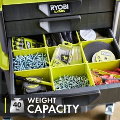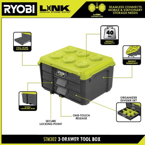 The RYOBI LINK Modular Storage System is revolutionizing the storage industry, enabling you to Organize, Access and Transport your life. The RYOBI LINK 3-Drawer Tool Box provides tool storage in the toughest of situations. Equipped with impact resistant material and a 40 lb. load capacity. Easily secure your portable tool storage with the stow-away steel lock bar and secure locking point. The full extension slides provide smooth operation while the included Organizer Divider Set provides maximum RYOBI tool storage organization, keeping small parts in their place. Seamlessly stack on to any RYOBI LINK Mobile Storage item. This is the perfect addition to your mobile tool box line up. Best of all, it is part of the RYOBI LINK Modular Storage System line of products that use the same locking technology to seamlessly connect your mobile and stationary storage needs. Own your space with RYOBI LINK Modular Storage System.