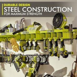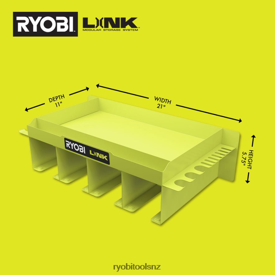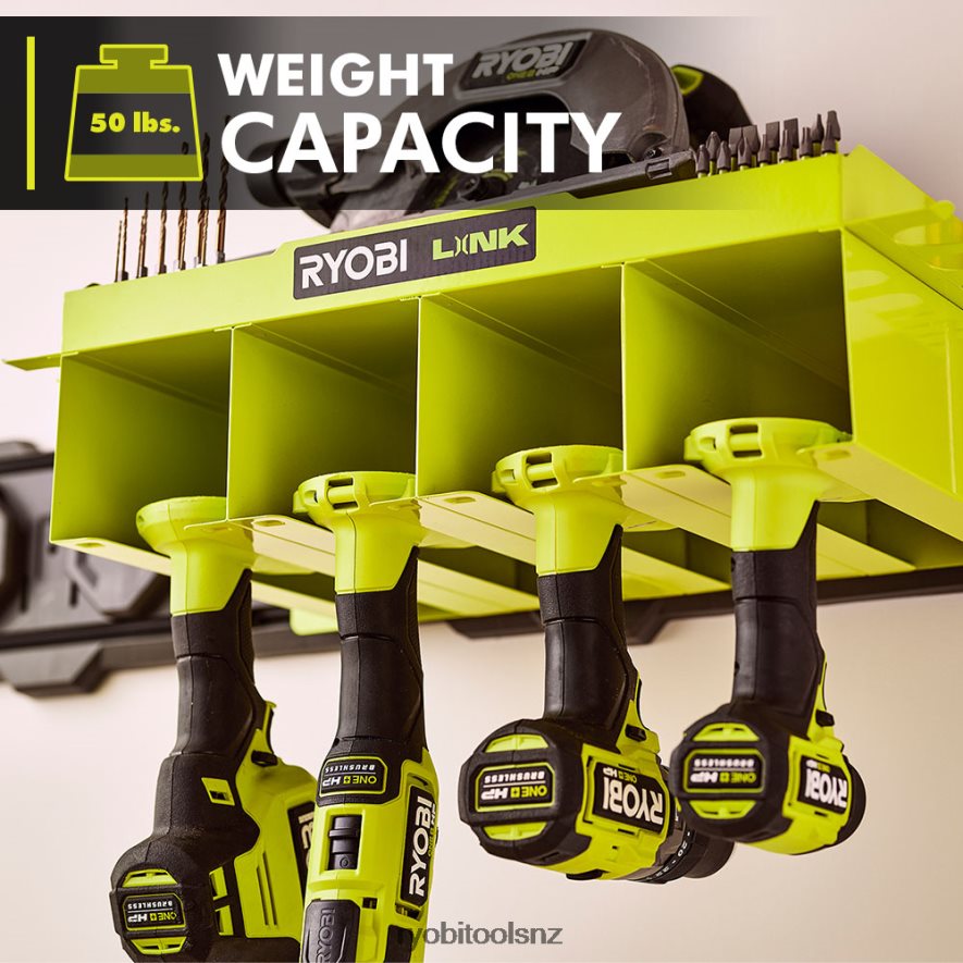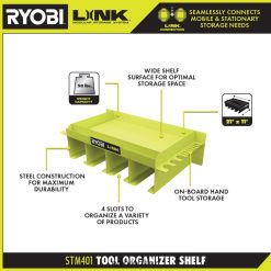 The RYOBI LINK Modular Storage System is revolutionizing the storage industry, enabling you to Organize, Access and Transport your life. The RYOBI LINK Tool Organizer Shelf is designed to maximize your storage space. The wide shelf surface, 4 power tool slots and on-board hand tool storage allow for maximum accessibility in tight spaces. The steel construction allows for a 50 lb. weight capacity.Best of all, it is part of the RYOBI LINK Modular Storage System line of products that use the same locking technology. Own your space with RYOBI LINK Modular Storage System.